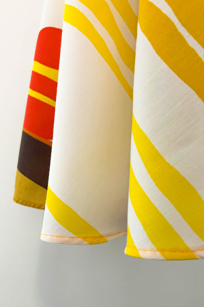 Retro stripes of caramel, gold, and burnt orange create a nostalgic sunset from this vintage 70s fabric