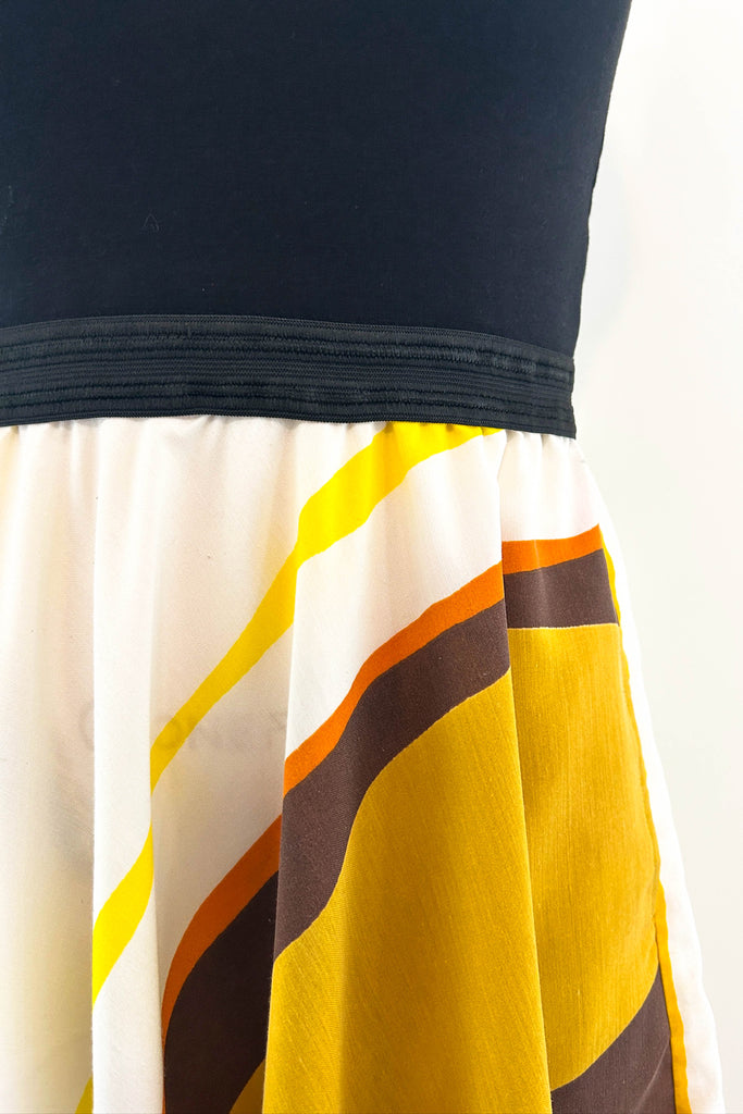 Retro stripes of caramel, gold, and burnt orange create a nostalgic sunset from this vintage 70s fabric